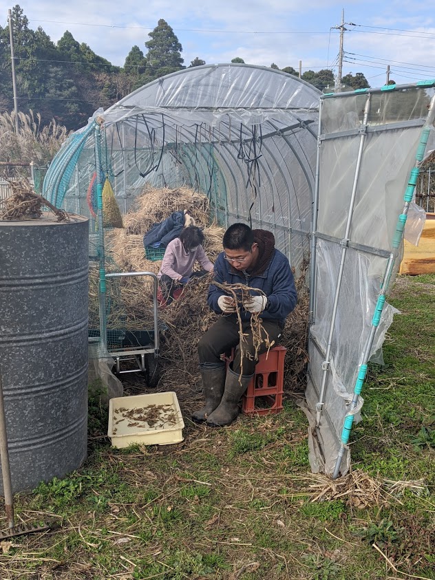 藁は10束丸めてハウスの中にしまった。いっちゃんも取りに来た。